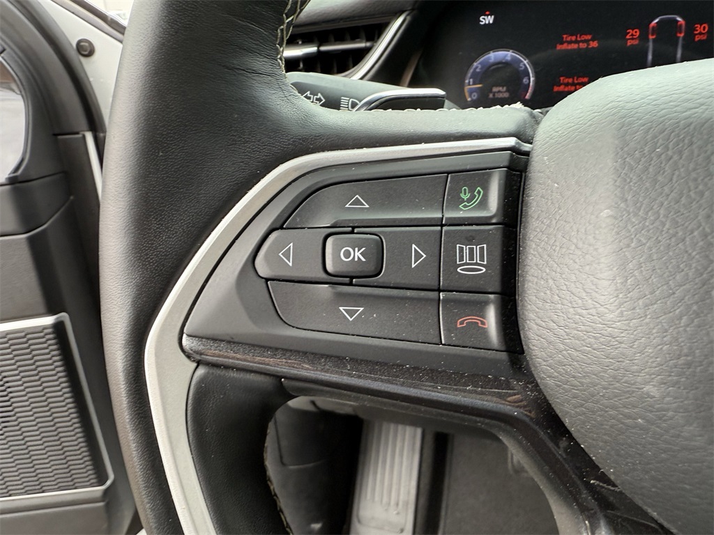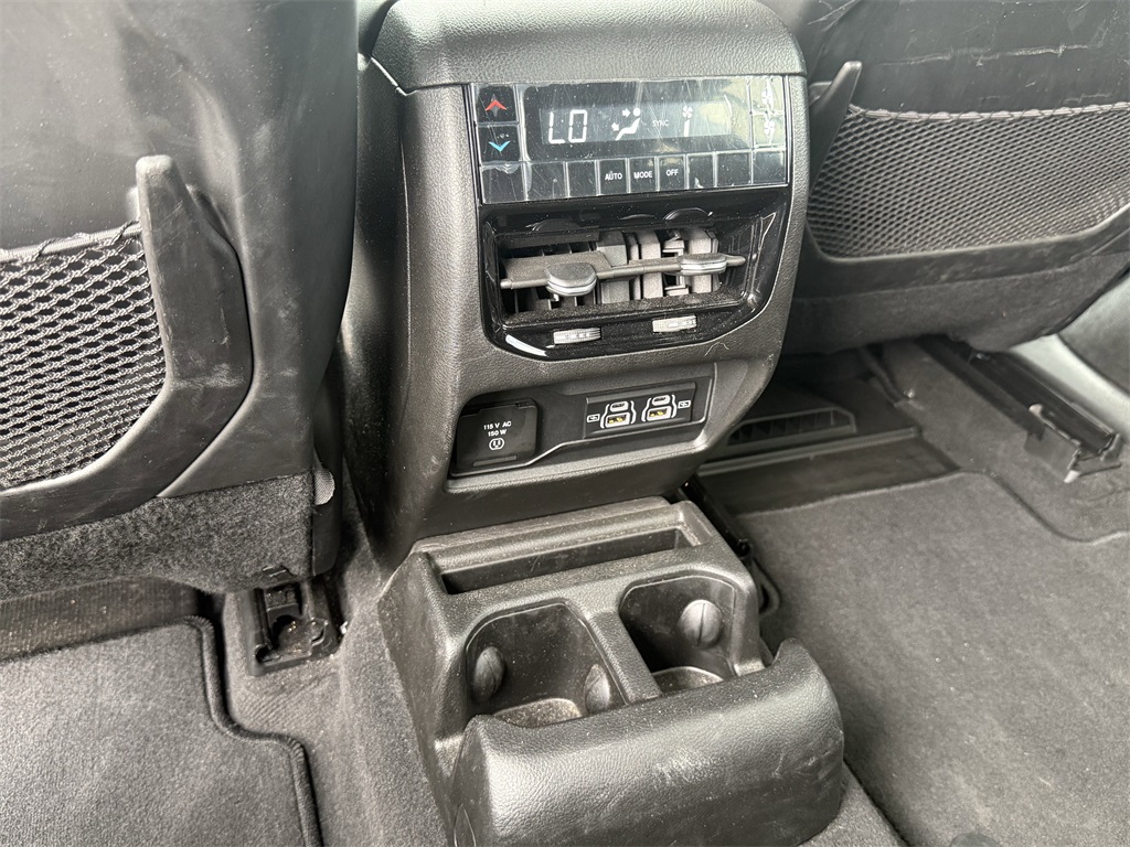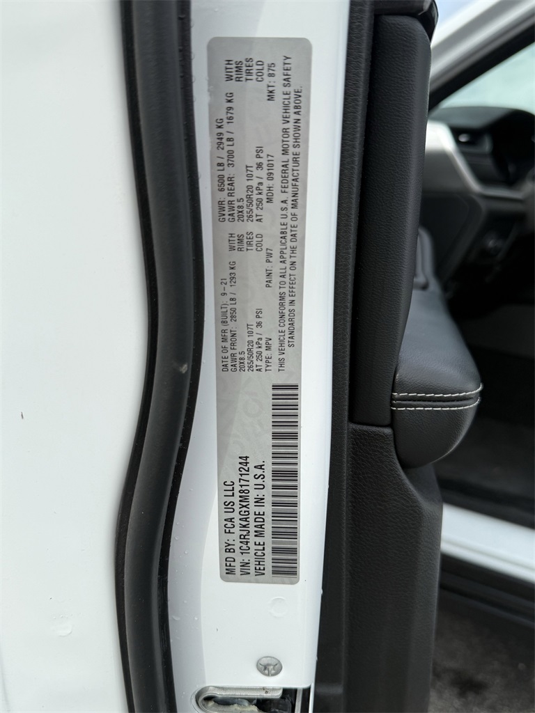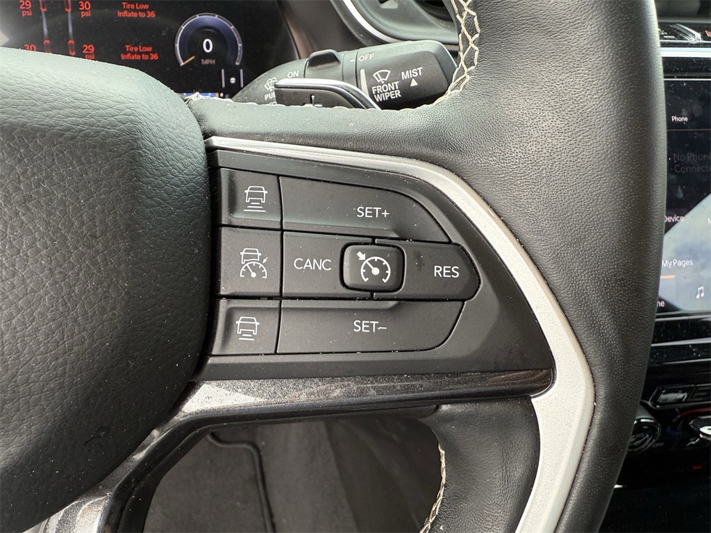 ring Wheel, Leather Trimmed Bucket Seats, Leather Wrapped Steering Wheel, Molded In Color Black/Gloss Black Roof Rails, Power Liftgate, Rain Sensitive Windshield Wipers, Remote Start System, Selectable Tire Fill Alert, Wheels: 20" x 8.5" Gloss Black Painted Aluminum, and Wireless Charging Pad), 3.45 Rear Axle Ratio, 3rd row seats: split-bench, 4-Wheel Disc Brakes, 6 Speakers, ABS brakes, Air Conditioning, Alloy wheels, AM/FM radio, Anti-whiplash front head restraints, Apple CarPlay/Android Auto, Automatic temperature control, Brake assist, Bumpers: body-color, Cloth Seats, Compass, Delay-off headlights, Driver door bin, Driver vanity mirror, Dual front impact airbags, Dual front side impact airbags, Electronic Stability Control, Emergency communication system, Four wheel independent suspension, Front anti-roll bar, Front Bucket Seats, Front Center Armrest w/Storage, Front dual zone A/C, Front reading lights, Fully automatic headlights, Heated door mirrors, Illuminated entry, Knee airbag, Low tire pressure warning, Manual Fold Seatbacks, Normal Duty Suspension, Occupant sensing airbag, Outside temperature display, Overhead airbag, Overhead console, Panic alarm, ParkView Rear Back-Up Camera, Passenger door bin, Passenger vanity mirror, Power door mirrors, Power driver seat, Power steering, Power windows, Radio data system, Radio: Uconnect 5 w/8.4" Display, Rear air conditioning, Rear anti-roll bar, Rear reading lights, Rear window defroster, Rear window wiper, Reclining 3rd row seat, Remote keyless entry, Roof rack: rails only, Security system, Speed control, Speed-Sensitive Wipers, Split folding rear seat, Spoiler, Steering wheel mounted audio controls, Tachometer, Telescoping steering wheel, Tilt steering wheel, Traction control, Trip computer, Turn signal indicator mirrors, Variably intermittent wipers, and Wheels: 18" x 8.0" Fully Painted Aluminum.