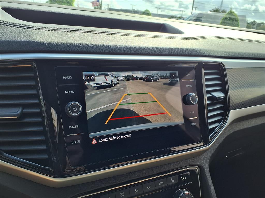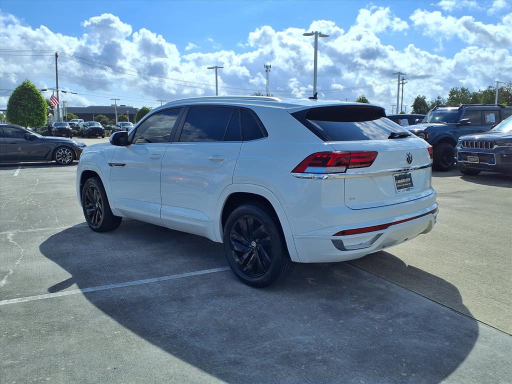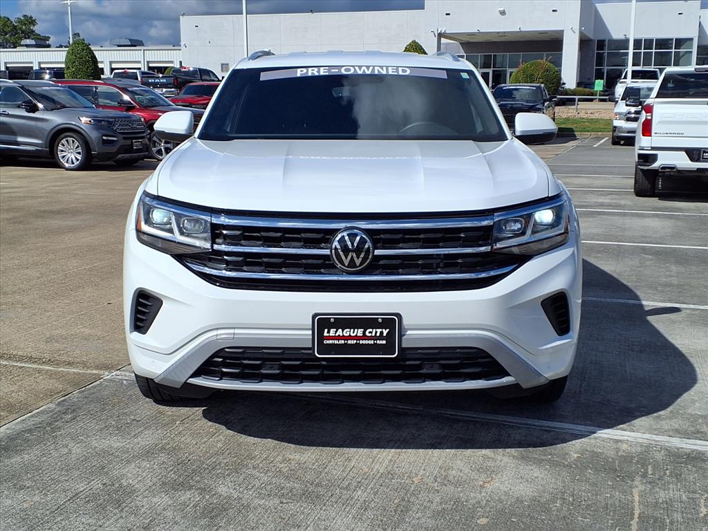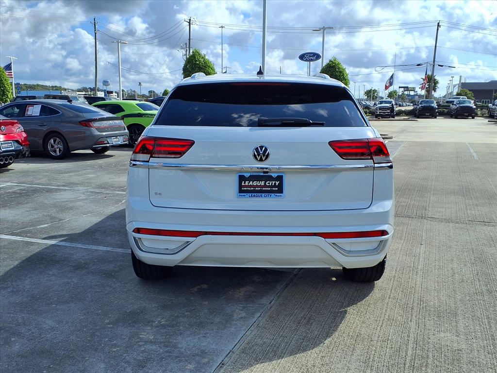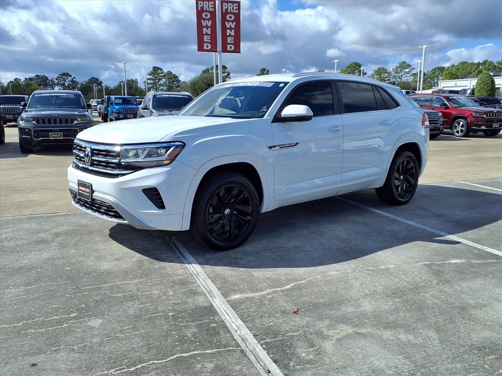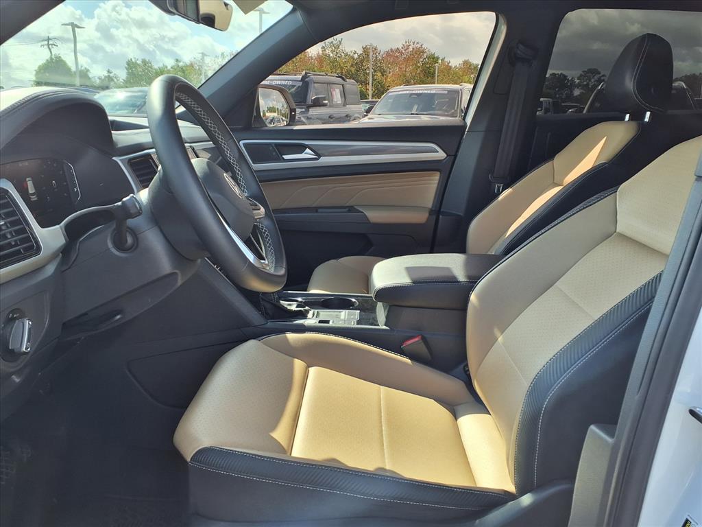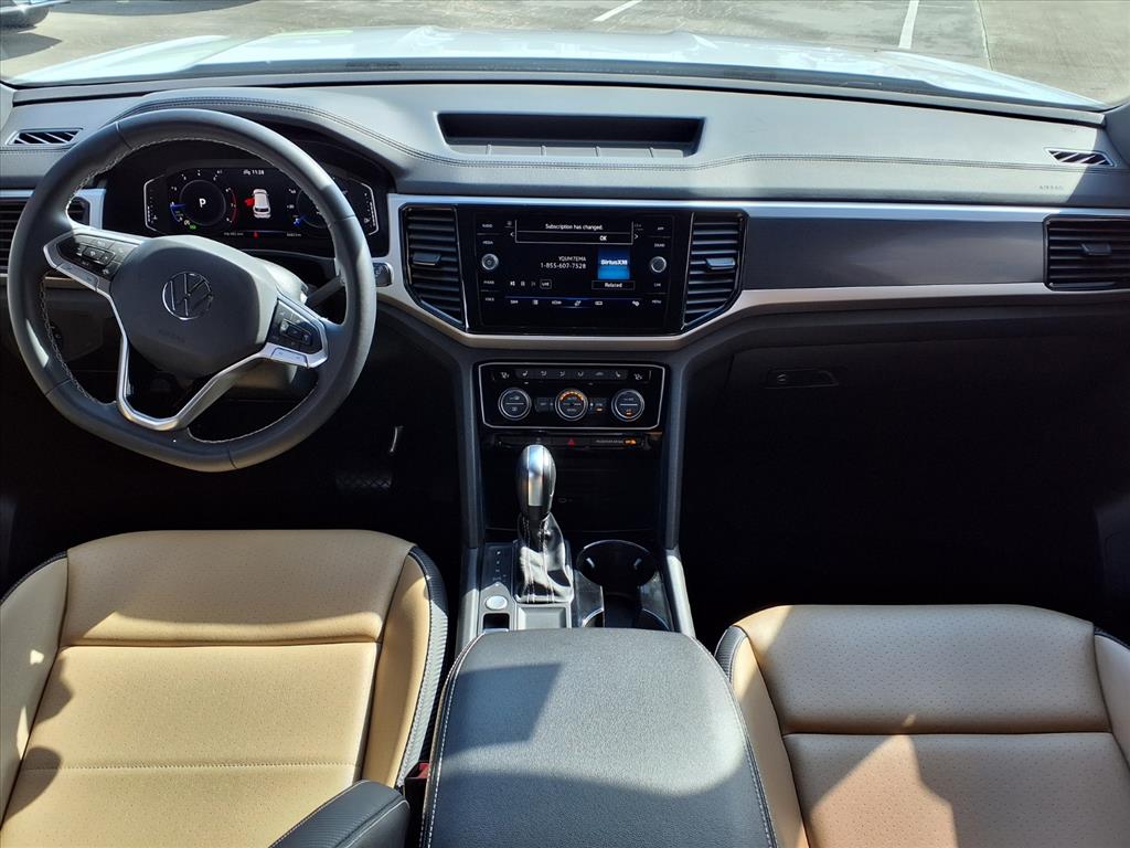 This vehicle is a 2023 Volkswagen Atlas Cross Sport 2.0T SE w/Technology, with a pure white exterior and a dark beige/titan black interior. It has driven 36,811 miles and has a 2.0 liter 4 cylinder engine, turbocharged engine that provides excellent fuel economy of 21 mpg in the city and 25 mpg on the highway. It has a crash test rating of 5 out of 5 stars and features such as blind spot sensor and hill start assist. This automobile is sure to turn heads with its sleek design and modern features