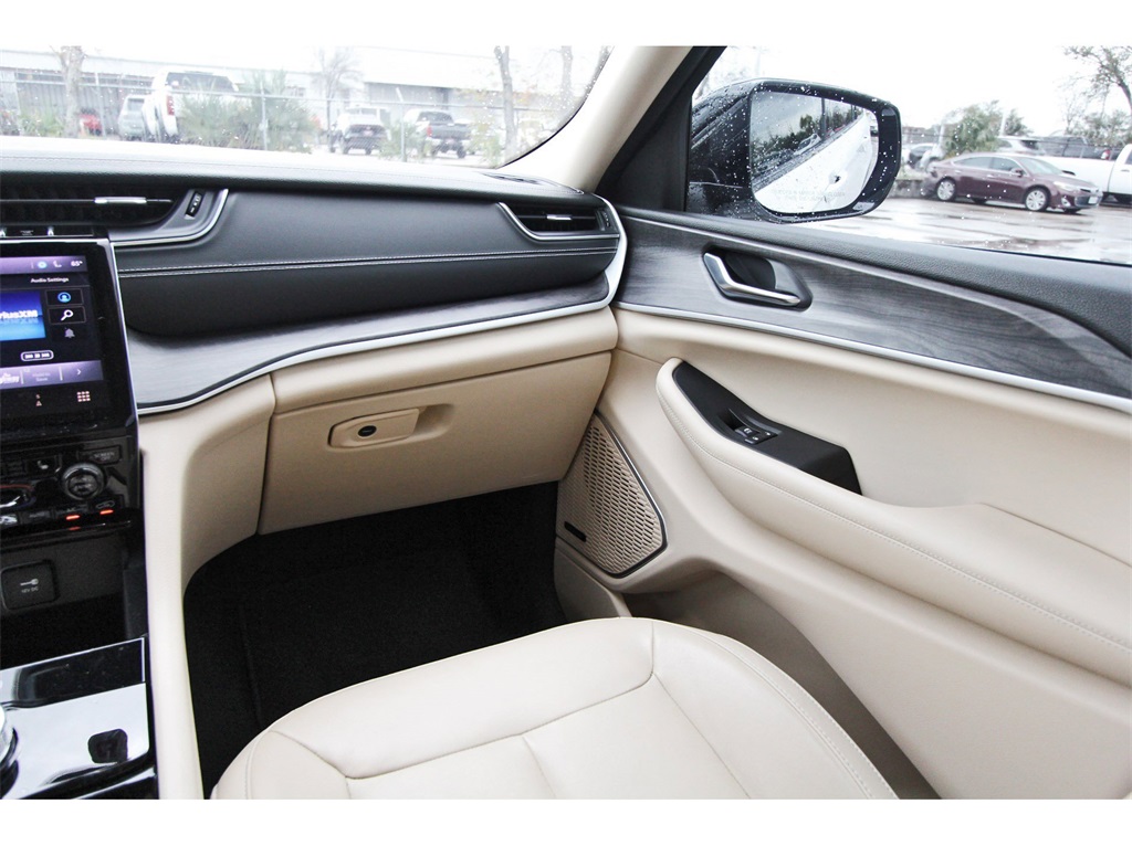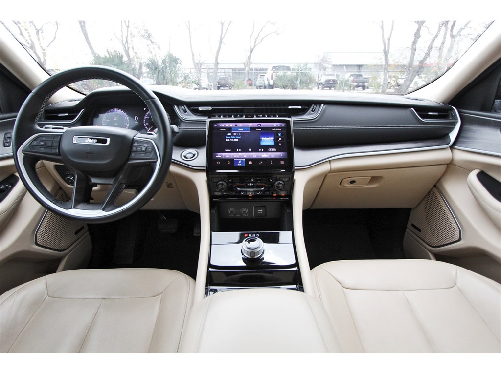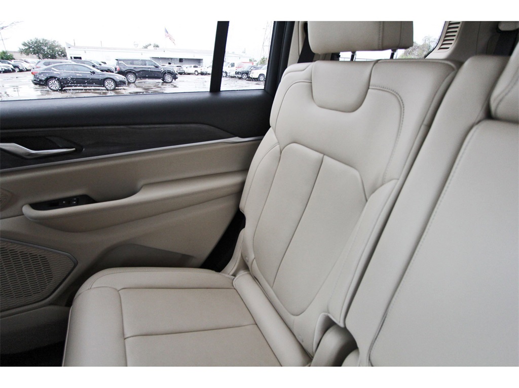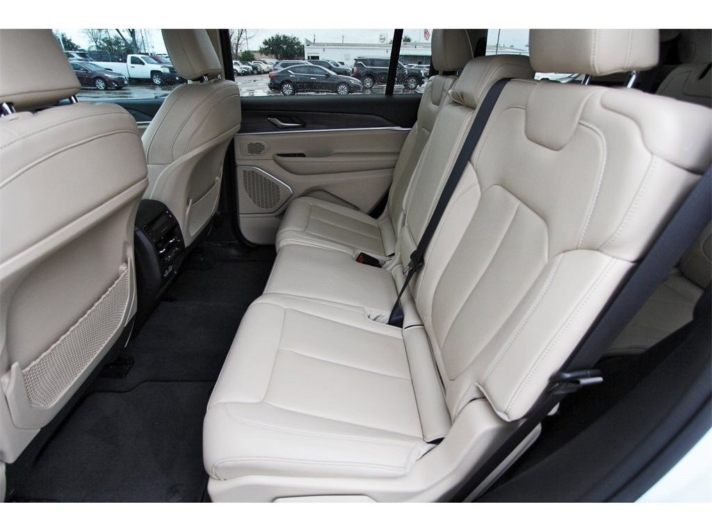Finished in Bright White Clearcoat with a Wicker Beige/Black leather interior, this Grand Cherokee L provides a comfortable cabin, upscale materials, and flex