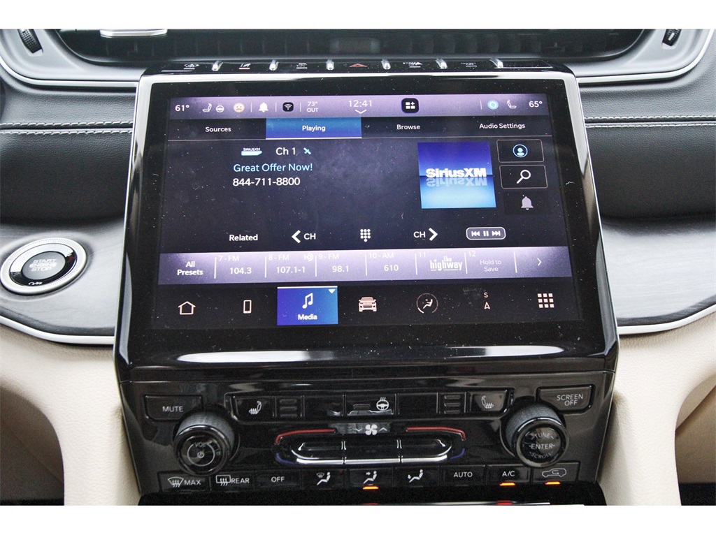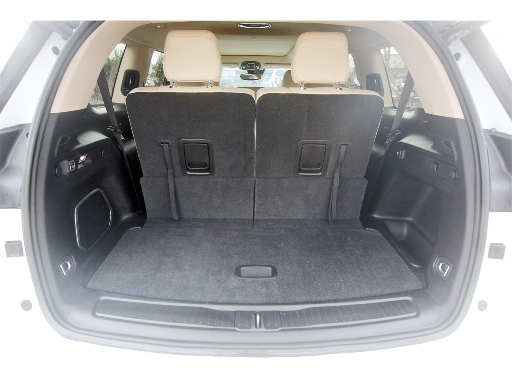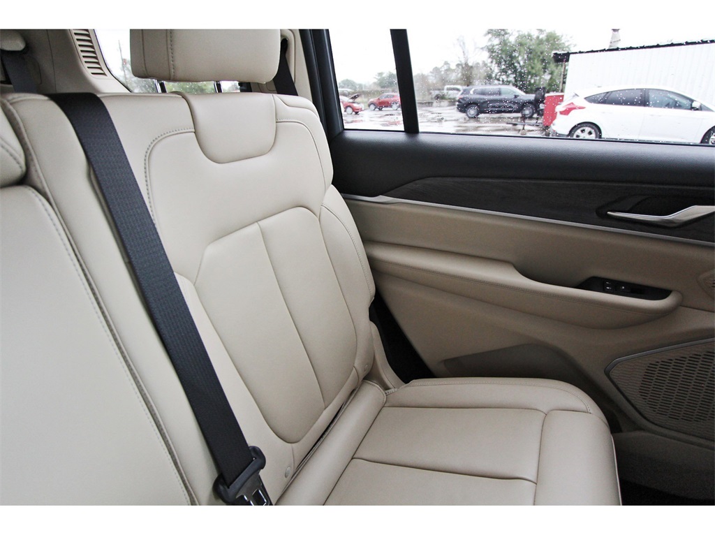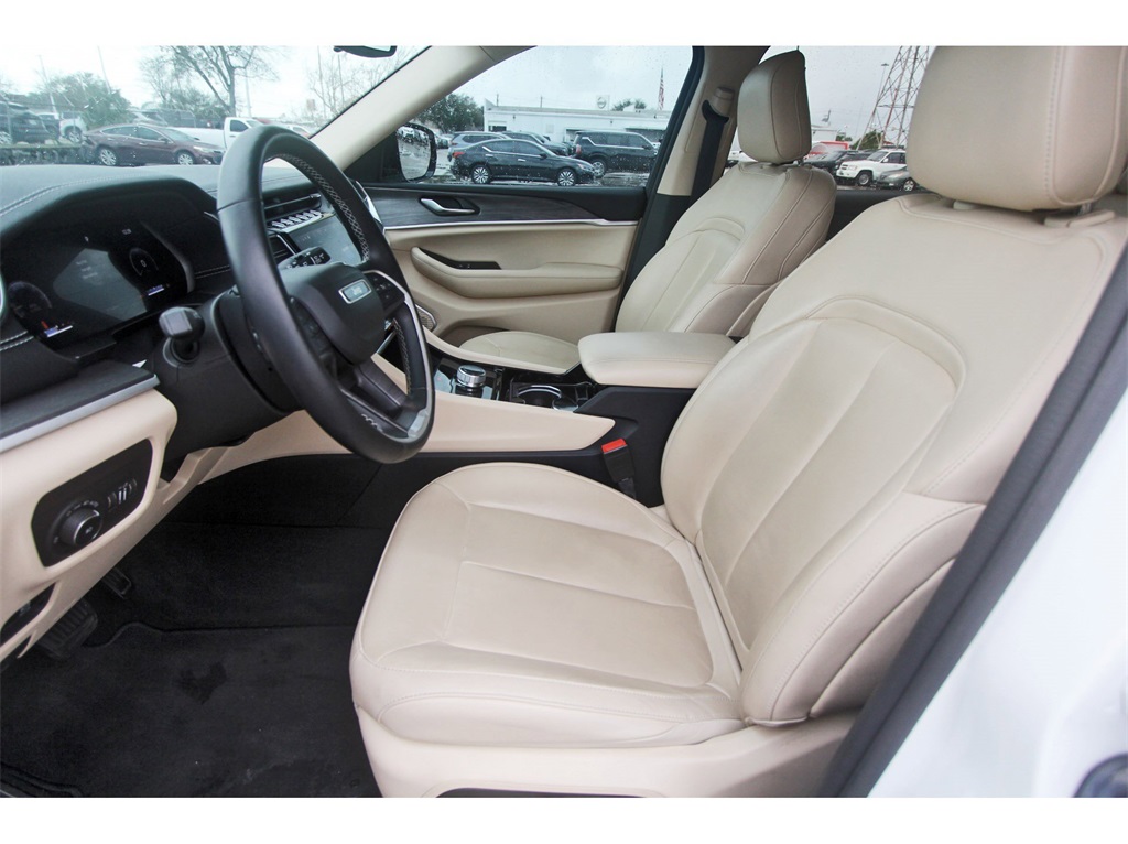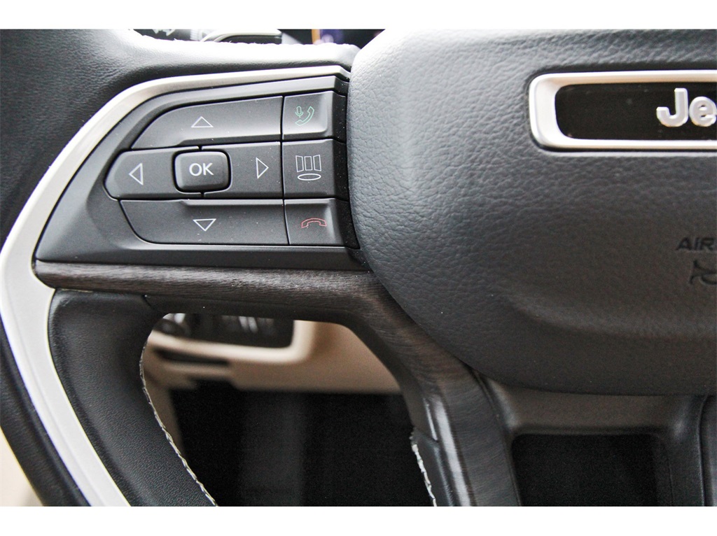 Finished in Bright White Clearcoat with a Wicker Beige/Black leather interior, this Grand Cherokee L provides a comfortable cabin, upscale materials, and flex